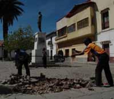 Trabajadores levantan, ayer, el empedrado de la plazuela Obispo Francisco